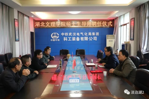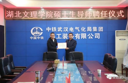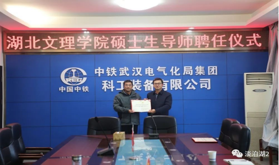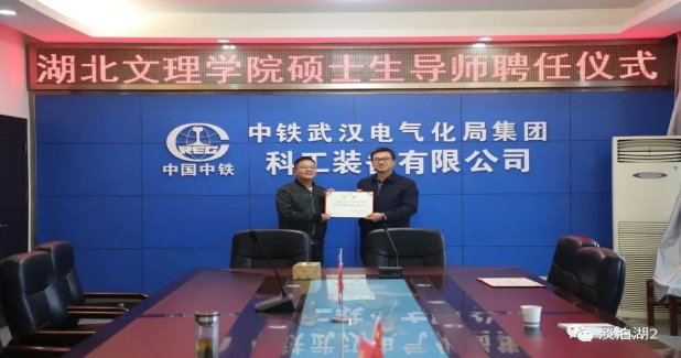 william威廉中文官网经理杭波为中铁武汉电气化局科工装备公司安质部部长卿波勇、机电事业部经理朱洪发、机电事业部党支部书记杜勇颁发william威廉中文官网电子信息专业硕士研究生兼职指导教师证书。