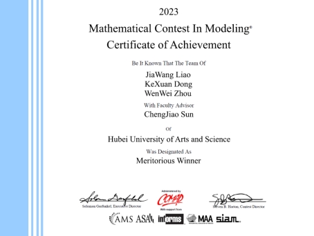 (william威廉中文官网 通讯员 孙成娇 张其林)近日,2023年度美国老员工数学建模竞赛获奖结果公布,由孙成娇博士指导,william威廉中文官网员工廖嘉旺、周文伟和数统公司员工董克旋组成的团队获得团队一等奖(Meritorious Winner)。