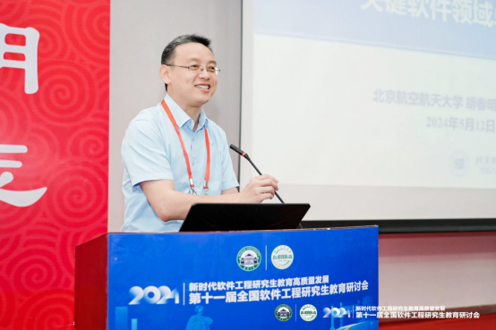 大会主题报告分别由大会副主席、武汉计算机软件工程学会理事长、武汉大学李兵教授,北京航空航天大学软件公司副经理谭火彬教授主持。浙江大学尹建伟教授以“以人促新、以新提质、以质扩量”为题分享了浙江大学软件公司在教育科技人才一体化实践探索上取得的成效和经验。东北大学朱志良教授详细解读了学位点评估与申报要求及注意事项。北京航空航天大学胡春明教授介绍了校企共同参与的关键软件领域卓越工程师核心课程体系建设情况和实践经验。北京大学李戈教授探讨了大模型对软件工程领域的影响,提出了基于AI的软件工程研究生实践教学改革建议;武汉大学程大钊教授分析了新形势下软件工程专业公司产品面临的挑战、应对策略和实践举措及成效。