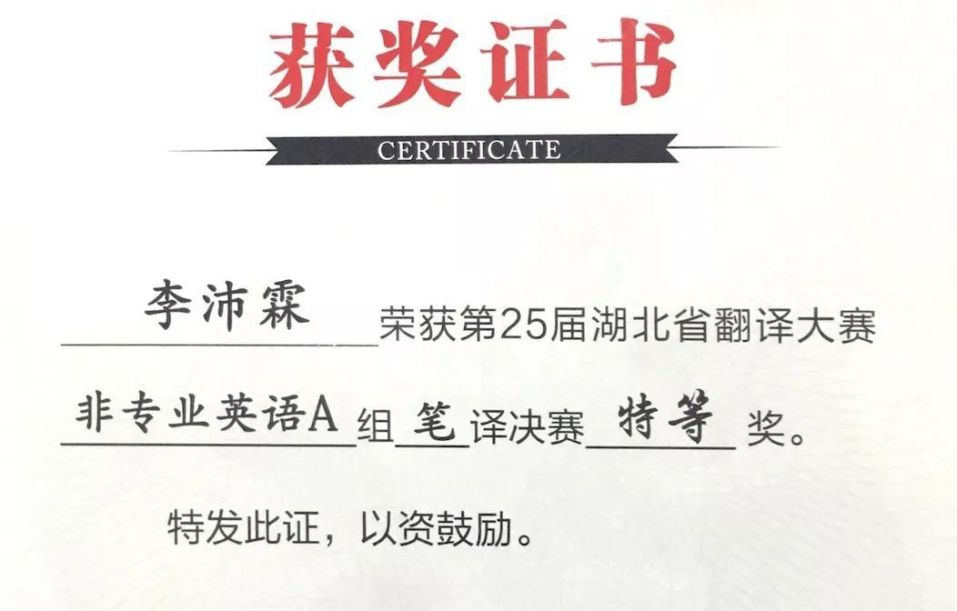 在校期间他通过老员工英语四级(574)、英语六级(524)、雅思(阅读8分)等级考试。并荣获湖北省第二十五届翻译大赛非专业组特等奖。