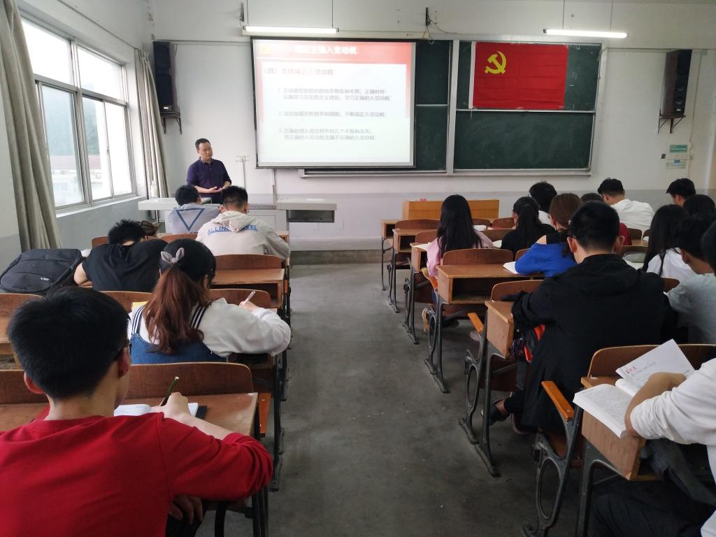 曹书记首先从端正入党动机讲起,为同学们详细讲述了什么是入党动机、入党动机不正确的具体表现和因素分析,以及怎样端正入党动机。接着讲解如何做一名合格党员,他为同学们总结了正确认识和对待党员标准、处理好十种关系、坚持做到“四个统一”和在日常工作学习中严格要求自己这四个要点。最后,曹书记强调组织上入党是一生一次,但思想上入党是一生一世,要成为一名合格的共产党员,入党积极分子们必须提高思想认识,要有奉献精神、吃苦精神,要严格要求自己。党课期间,曹书记引用共产党所经历的历史事件,枚举众多共产党员的英雄事迹,为同学们带来了一节生动的党课。学员们认真听讲,做笔记。