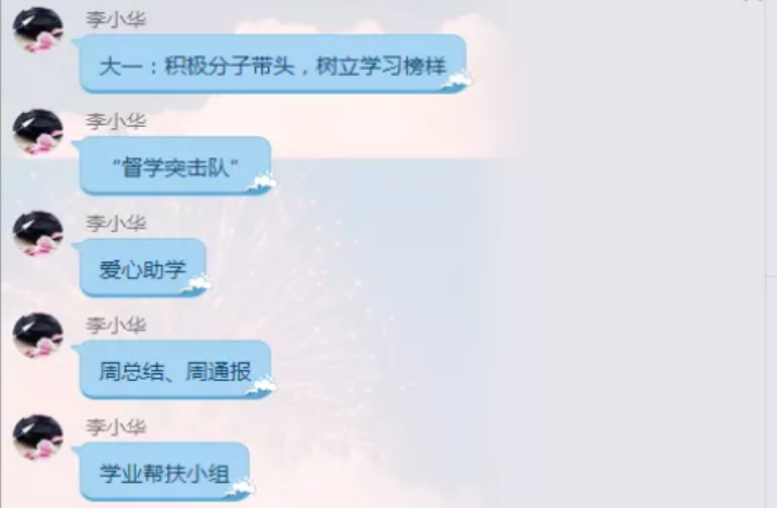 李小华作总结讲话。她指出,疫情期间“停课不停学”,要发挥员工党支部的战斗堡垒作用,作为“关键的少数”群体要发挥好员工党员的先锋模范作用。根据各个年级的不同情况,她提出不同的具体要求。大一积极分子要带头,树立学习榜样,以“互相督促,互相帮助”、“做好周总结、周通报”、“成立学业帮扶小组”、进行“班级优秀作业、精美笔记评比,课程心得方法分享”等形式,带动、营造班级浓厚的学习氛围、引领形成自律学习的好习惯。大二员工党员要虚网实做,助力学习,通过“成立网络‘先锋岗’”、“组织网络班会,在线学习分享”、“组成线上‘CP’,互帮互助学习,朋辈互助学习”的方式发挥模范带头作用。大三员工党员要有责任担当,促进规划,从“建立不同科目补考群”、“考研资料共享”、“关心同学,及时发现他们在学业、生活等方面的困难和问题,及时提供帮助”等方面体现党员的先进性。大四员工党员要发光散热,精准帮扶,“做好学业帮扶”、“做好就业帮扶”、“实施一对一帮扶、点对点提醒”,在毕业前的这几个月,为同学们做好服务。