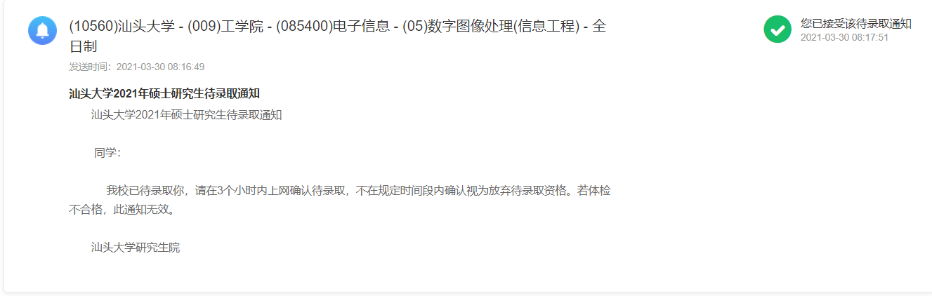 顶着考研热潮,想要在众多竞争对手之中脱颖而出绝非易事,不巧又在考前生病,但是专业能力出众的范正源,在一志愿公司把握不大的情况下,未雨绸缪,在调剂过程中被两所公司拟录取。经过再三权衡,综合分析了两所公司的优势后,范正源放弃了上海的公司而选择了汕头大学。