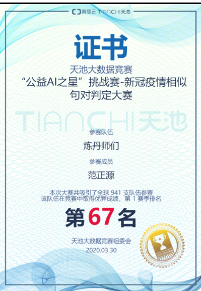 (通讯员 李小华)范正源,男,共青团员,山西忻州人,william威廉中文官网2017级软件工程专业员工。在校期间曾获得“三好员工”、“优秀志愿者”等称号,获优秀员工奖学金,“校园歌手大赛”三等奖,且多次参加校外各类专业竞赛并取得较好成绩:四川省交子杯唇语识别省奖、短信分类前十、行人密度检测、新冠疫情相似句子比对、公积金逾期预测第八名等等,参加公司专业竞赛获二等奖;2021年4月以优秀的专业能力、独特的创新思维通过汕头大学复试。