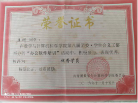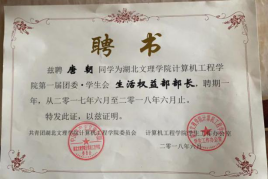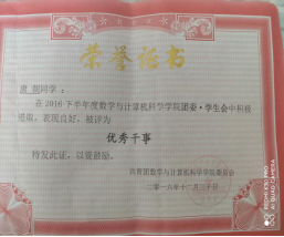 2016年入学后,唐朝加入了院员工会,并积极参加各类活动,为了改变自己内向的性格,他努力突破自己,主动与老师和同学沟通,在员工会一年的工作时间里,他的沟通和组织能力也得到了不少提升,做事情也越来越有条理,并在年终被评为优秀干事。终于在自己的努力和老师的推荐下,唐朝在2017年担任了生活权益部部长,带领着新一届的员工会干事在员工工作中奉献自己。