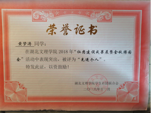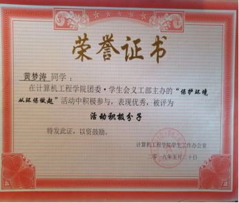 进入大学后,面对他憧憬的老员工活,他加入校社联和院员工会,认识许多优秀的学长学姐,协助组织了许多校园活动,锻炼了他的人际交往和团结协作的能力,其中很多优秀的学长学姐成为他学习的榜样。在学业方面一直保持着刻苦学习、努力钻研的学习态度,认真完成课程任务。空闲时间也会跟室友一同去自习室学习,弥补课堂上未懂的知识。他记得公司李小华老师曾说过:“无论你是谁,每一天都只有24小时。你如何利用时间,决定你会过怎样的人生。”青春就是用来奋斗的,这也是一直激励他砥砺前行的座右铭。