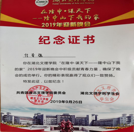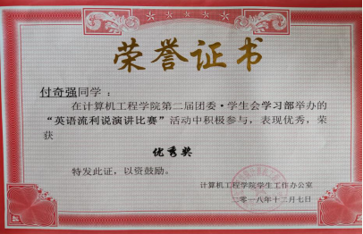 付奇强为人积极向上,活波开朗。大一时加入院员工会新宣部,积极参加公司各种活动并负责为公司拍照撰写通讯稿。在新宣部工作期间锻炼了良好的沟通能力以及团队合作意识。除了正常的学习和生活,付奇强对文体活动也具有浓厚的兴趣,大一至大二期间坚持练习舞蹈并多次在学院元旦晚会和校迎新晚会上表演节目,课余时间还考取了CSDA国家街舞三级教练员。健康有益的兴趣爱好对付奇强来说无疑是生活的助力剂。