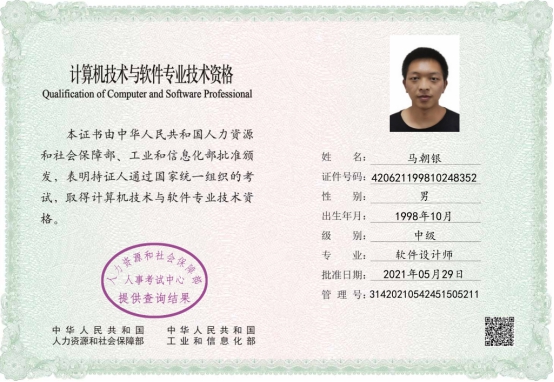 随着专业所学知识的深入,他发现自己的专业基础有些缺乏,为了夯实基础知识,他决定报考计算机技术与软件专业技术资格(水平)考试,通过系统复习,在2021年他通过计算机技术与软件专业技术资格考试,获得了软件设计师(中级)证书。