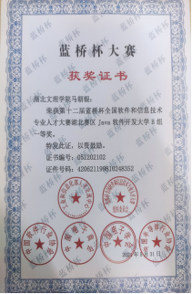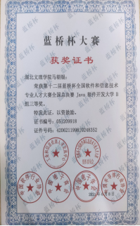 在完成自己学业之外的时间,积极参加学科竞赛,在第十二届蓝桥杯大赛中荣获省赛一等奖,国赛三等奖的成绩。