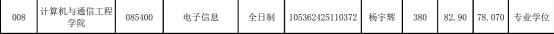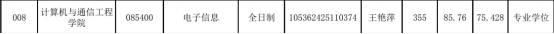 最终杨宇辉以政治73分,英语(二)77分,数学(二)119分,数据结构(850)111分,总分380分,总排名第10名,王艳萍以政治75分,英语(二)67分,数学(二)104分,数据结构(850)109分,总分355分,总排名第30名一起录取到长沙理工大学计算机与通信工程公司。